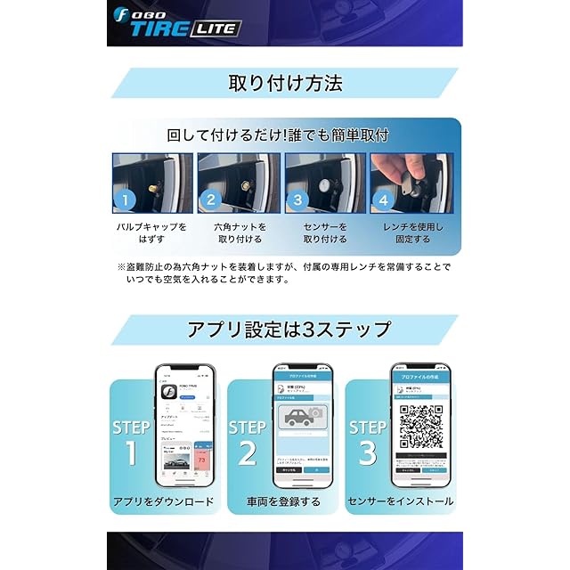 FOBO TIRE LITE 空気圧センサー タイヤ空気圧監視システム 取付簡単 スマホでチェック 車 防水 技適取得 日本語説明書付属