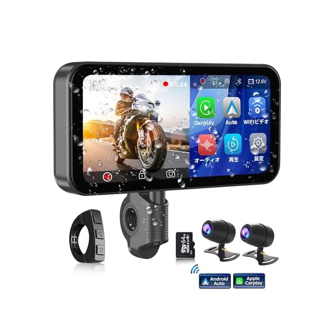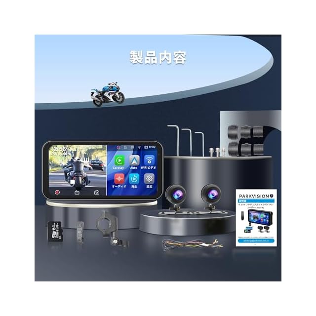PARKVISION バイク ドライブレコーダー CarPlay/Android Auto対応 6.25"大型液晶モニター WiFi内蔵 自動輝度調整 エンジン連動 ループ録画 音楽再生/通話/ナビ機能 取付ホルダー・有線コントローラー IP67防水防塵 64GBメモリーカード同梱 技適取得済み 日本語マニュアル付属
