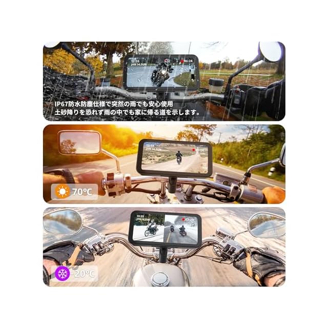IP67防塵防水&最新ナビゲーション機能: 本体全体はIP67防水仕様をサポートしており、オートバイ用ドライブレコーダーも前後カメラも完全に防水で悪天候のツーリングでも安心して使用られます。-20℃から70℃の範囲で動作可能です。バイク用ナビはお使いのスマートフォンにインストールした地図アプリを画面に表示。普段から使い慣れている地図アプリを使用することで、地図を更新するための余計な費用も必要なく、常に最新の情報を表示できます。