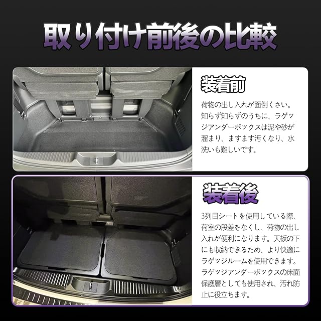 【荷室の段差をなくす】3列目シートを使用している際、荷室の段差をなくし、荷物の出し入れが便利になります。天板の下にも収納できるため、より快適にラゲッジルームを使用できます。ラゲッジアンダーボックスの床面保護層としても使用され、汚れ防止に役立ちます。