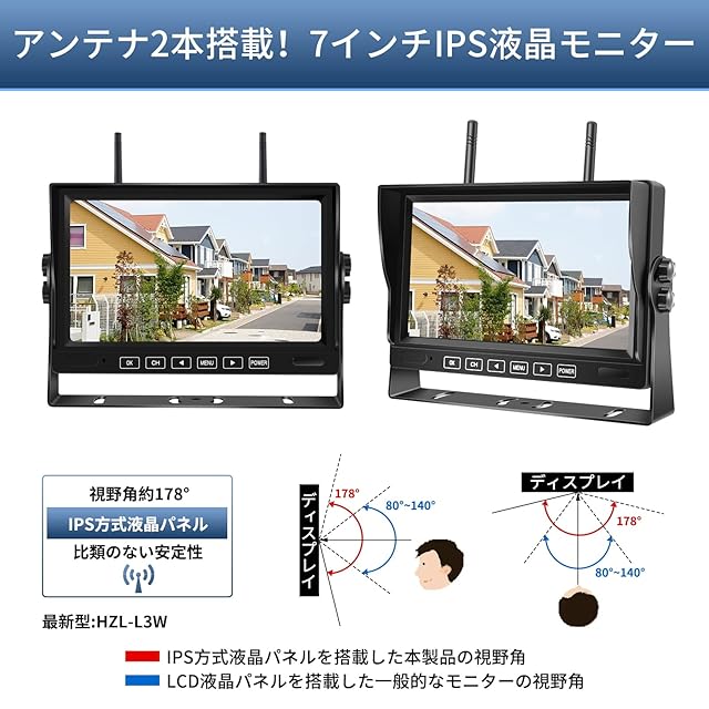 【広視野角対応本製品】豊かな色彩表現で広い視野角を誇るIPS方式液晶パネルを搭載したワイヤレスバックモニターは、高精細かつ高輝度な画面を実現し、斜めから覗き込んでも色の変化、輝度の変化が少なく、とてもキレイに見えます。