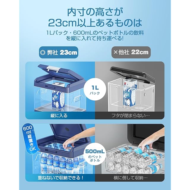 【コンパクトボディに、秘めた驚きの収納力】サッと冷えたドリンクや食べ物を取り出せるので、真夏のお出かけは快適そのもの。✅従来の車用冷蔵庫は内部の高さがわずか21cmのため、500mlのペットボトルや1Lのパックを縦に入れて持ち運ぶことができず、出し入れすらひと苦労となる!✅そこで、弊社は内部の高さを驚異の24cmにまで革命的に進化させ、1Lのパックや600mlのペットボトルを縦に楽々収納でき!コストが20%上昇したにもかかわらず、空間活用効率は驚きの42%もUPし、ついに15Lの大容量を実現!✅さらに、350ml缶ビールなら19本、600mlのペットボトルは12本、1.5Lのペットボトルなら4本収納でき、BBQやキャンプに理想的な収納スペースを提供し、旅行のお土産保存などにも大変便利です。