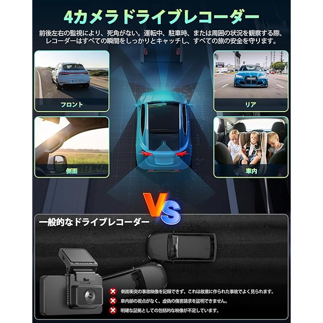 LAMTTO 4カメラ ドライブレコーダー 車前車左右車後四つカメラ同時録画 どらいぶれこーだー 3.16インチ液晶画面 360°全方位保護 1080P 駐車監視 動体検知 Gセンサー WDR技術 小型ドラレコ 全国LED信号機対策 簡単取付 日本語説明書付き