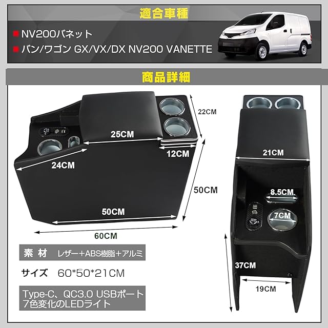 【適合車種】コンソールボックスはNV200バネット バン/ワゴン GX/VX/DX NV200 VANETTE 右ハンドル車に適用する。アームレスト本体のサイズは60*50*22cmです。※純正のリッド付センターコンソールボックス装着車には装着できません。車種やサイズをご確認の上ご購入ください。