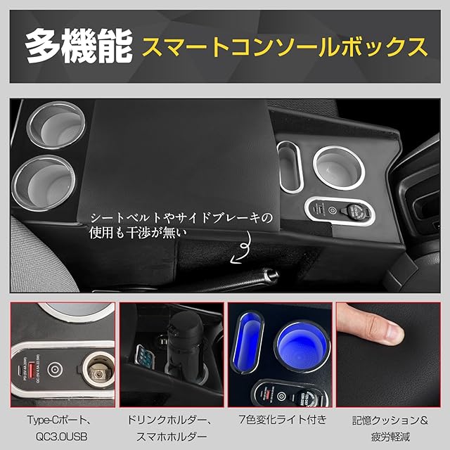 WALKEY【急速充電 7色変換】コンソールボックス NV200 バネット 適用 車 アームレスト 日産 適用 バン ワゴン GX/VX/DX NV200 VANETTE 専用 呼吸ランプ センターコンソールボックス スマートコンソール 肘置き Type-C QC3.0 USBポート ドリンクボルダー付き 小物入れ 多機能 収納便利