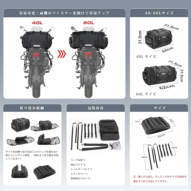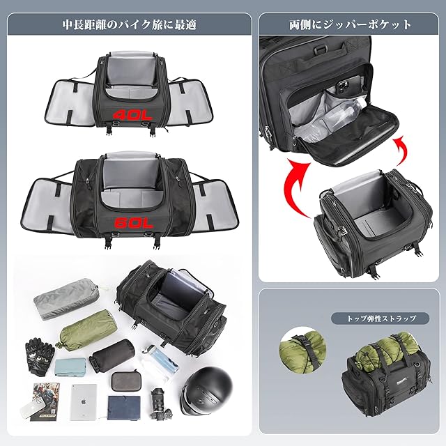 【大容量収納】40-60L容量可変。両サイドのファスナーを開ければ簡単に容量アップ。ちょっとした荷物の整理に役立つサイドポケットを装備。中距離・長距離ツーリングやキャンプに最適です。