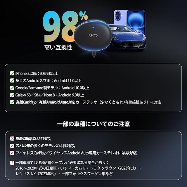 幅広い車種に対応:有線のCarPlayまたはAndroid Autoに対応した純正/社外ナビでご利用いただけます。あなたのカーライフを、もっと自由にする一台です。誠に恐れ入りますが、BMW、およびSUBARUの多くの車種には対応しておりません。あらかじめご了承ください