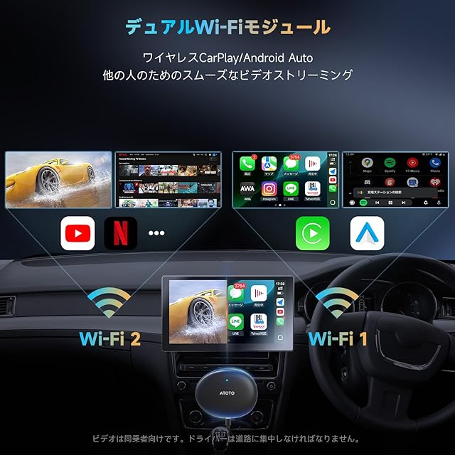デュアルWi-Fiモジュール: 一方はワイヤレスCPAA用、もう一方はインターネット接続用。YouTubeやNetflixをプリインストール、Spotifyは FindAppsからダウンロード可能。スムーズなナビと通話が楽しめます
