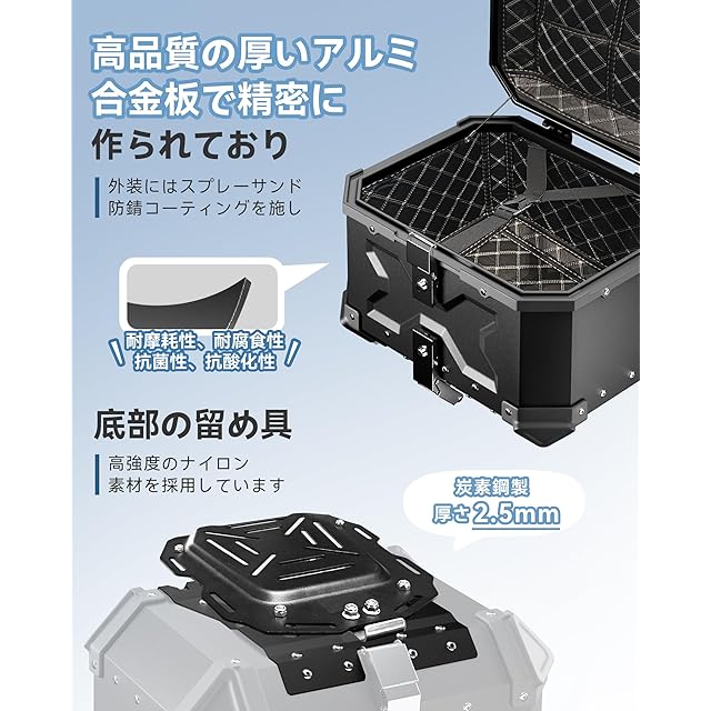 【高強度アルミボックス バイク、頑丈で耐久性抜群】バイク用リアボックスは、2mm厚の高品質アルミ合金製で、酸化防止と耐腐蝕処理を施しています。長期間の屋外使用でも美しさと性能が持続。四隅にはハイテクポリマー樹脂で補強されており、耐衝撃性が大幅に向上。バイク リアボックスの外側はサンドブラスト加工で防錆コーティングされ、耐摩耗性と耐腐蝕性に優れ、メンテナンスも簡単で長持ちします。