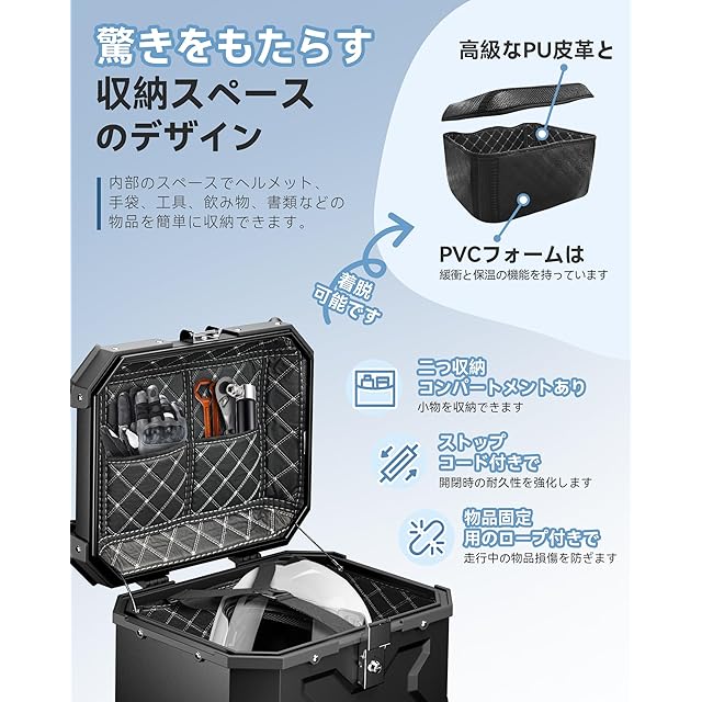 【45L大容量設計、多様な収納ニーズに対応】バイク トップケースは四角形の構造で収納スペースを最大限に活用でき、ヘルメットやレイングッズもすっきり収納できます。内部には厚手のPU内張りとPVCフォーム底材を使用し、優れた防震・保温効果があります。内張りは取り外して洗えるため、清潔を保てます。また、実用的なポケット付きで小物の整理にも便利です。(注:革製品のため、開封後は風通しの良い場所で3日間ほど放置してください。)