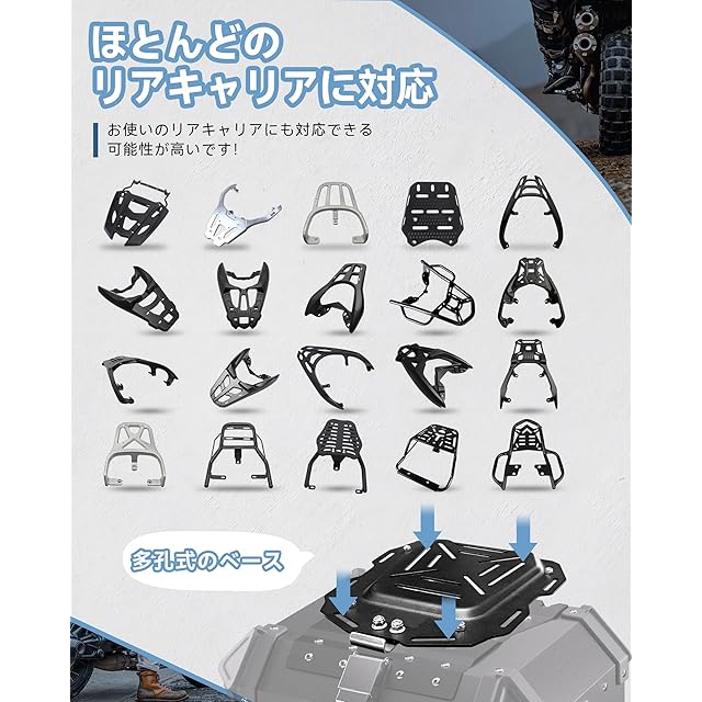 【簡単取り付け、多様な車種に対応】バイクボックス トップケースは簡単に取り付け可能で、多様な車両キャリアに対応。底部は2.5mm厚の高強度カーボンスチール製で、4つの固定穴を備えており、安定性と耐久性に優れています。工具不要で、ベースをキャリアに取り付けた後、トランクをロックするだけで完了。自宅やホテル、旅館、キャンプ場でも、女性ユーザーでも簡単に取り付け可能です。