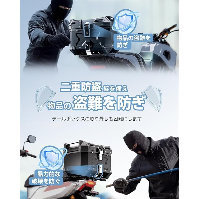【ダブルロック設計、防犯性抜群】バイク トップケースは、ステンレス製防犯ロックを採用し、ダブルロック設計で、ロックをかけるとベースとリアボックス バイクが同時に固定され、盗難防止に効果的です。頑丈な金属構造により破壊されにくく、特殊な鍵設計でピッキングも困難。ロックにはダンパー付きで、確実にロックがかかります。操作もスムーズで使いやすい設計です。ステンレス材質は腐蝕や錆びに強く、長期間使用しても安心です。