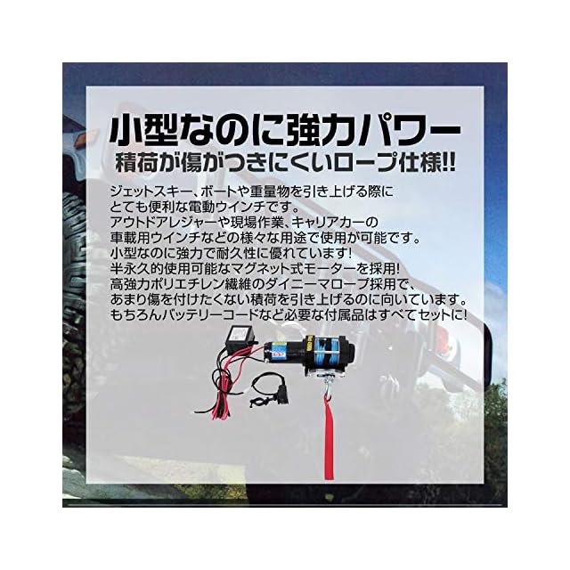最大牽引力2014kg!小型でも強力パワー! ジェットスキー、ボートや重量物を引き上げる際にとても便利な電動ウインチです。 カー電源対応!車のDC12Vバッテリーに繋げて使用します。 半永久的使用可能なマグネット式モーターを採用。 積荷が傷つきにくいロープタイプです。