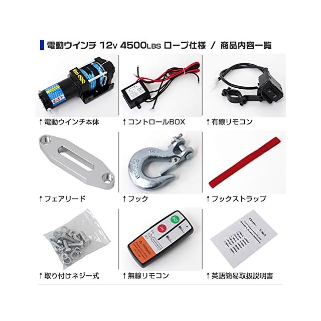 【内容】 電動ウィンチ本体 ×1 コントロールBOX ×1 有線リモコン ×1 フェアリード ×1 フック ×1 フックストラップ ×1 取り付けネジ一式 無線リモコン ×1 英語簡易取扱説明書 ×1
