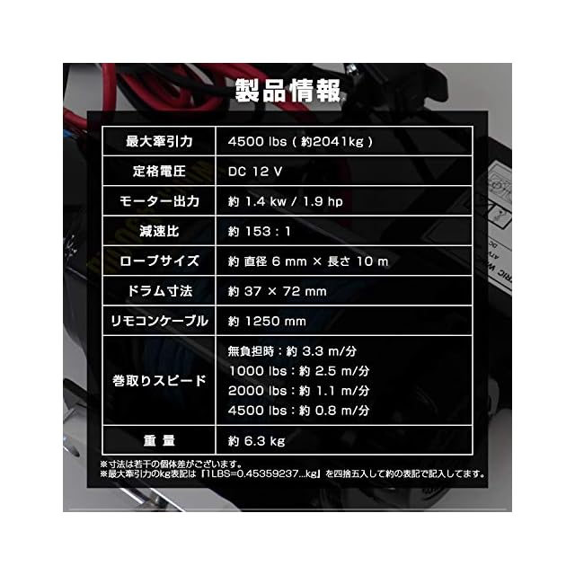【仕様】 巻き上げ重量:4500LBS(2041kg) 定格電圧:DC12V ギア比(減速比):153:1 モーター出力:(約)1.4kw / 1.9hp ロープサイズ:(約)直径6mm×長さ10m ドラム寸法:(約)37mm×72mm リモコンケーブル:(約)1250mm 重量:(約)6.3kg 防水仕様 巻取りスピード 無負担時:(約)3.3m/分 1000lbs:(約)2.5m/分 2000lbs:(約)1.1m/分 4000lbs:(約)0.8m/分