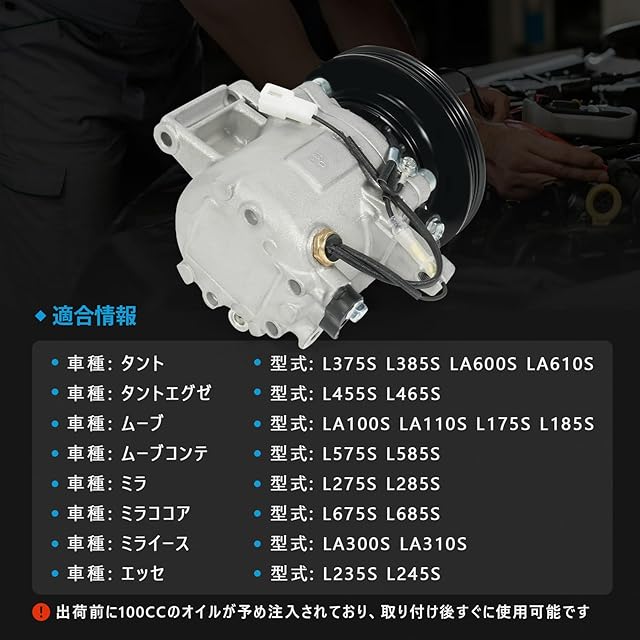 【商品説明】本商品は、タント L375S L385Sなどの車種に対応した高品質のエアコンコンプレッサーです。高い互換性を持ち、取り付けも簡単で、専門知識がなくても交換作業が可能です。出荷前に100CCのオイルが予め注入されており、取り付け後すぐに使用可能ですが、オイル量や補充の調整が必要な場合は、車両の整備マニュアルに従って作業を行ってください。