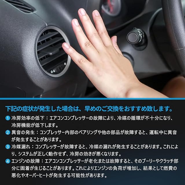 【劣化現象】下記の症状が発生した場合は、早めのご交換をおすすめ致します。①冷房効率の低下:エアコンコンプレッサーの故障により、冷媒の循環が不十分になり、冷房機能が低下します。②異音の発生:コンプレッサー内部のベアリングや他の部品が故障すると、運転中に異音が発生することがあります。③冷媒漏れ:コンプレッサーが故障すると、冷媒の漏れが発生することがあります。これにより、システムが正しく動作せず、冷房の効きが悪くなります。④エンジンの故障:エアコンコンプレッサーが老化または故障すると、そのプーリーやクラッチ部分に固着が生じることがあります。これによりエンジンの負荷が増加し、結果として燃費の悪化やオーバーヒートが発生する可能性があります。