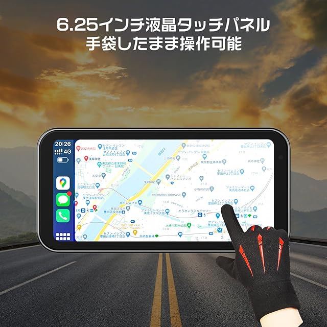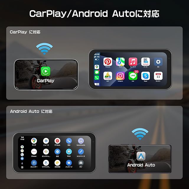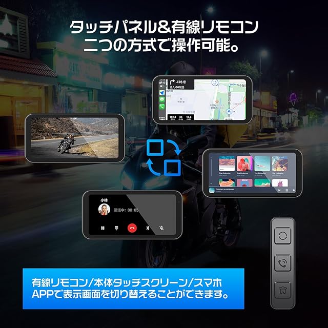 【Carplay/AndroidAuto対応/音声案内】:CarPlay/Android Autoに対応。バイクに乗りながらナビゲートしたり、電話をかけたり、お気に入りの音楽を楽しんだりすることができます。Siri/google_assistant などを介して音声案内を実現できます。さらに、スマホがBTイヤホン/インカムと接続されている場合、音声はイヤホン/インカムから出されて、快適で便利なドライブ体験を提供できます。