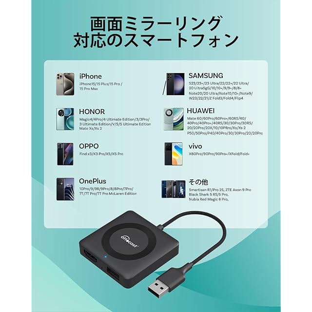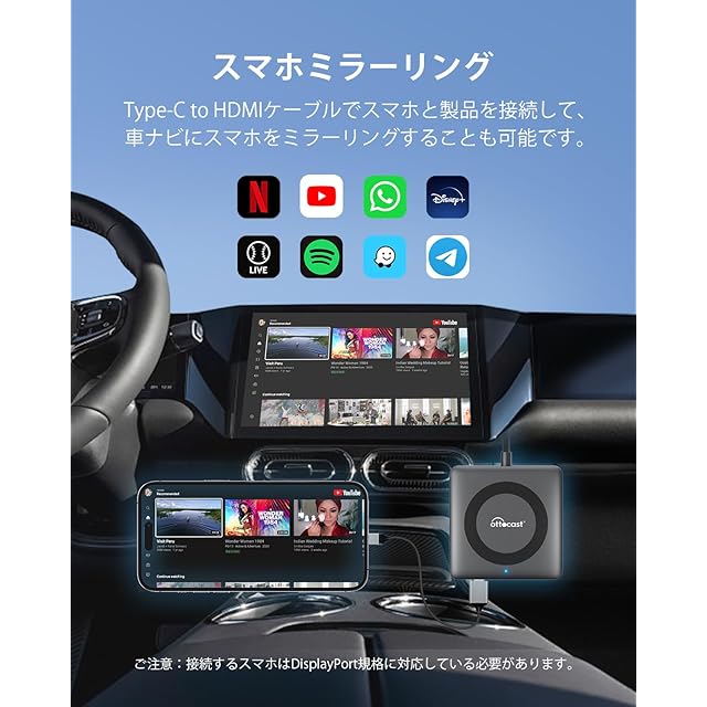 *本アダプターは後部座席のリアモニターに映せないです。また、ワイヤレスCarPlay機能とワイヤレスAndroid Auto機能がありませんので、ご注意ください。*本製品のミラーリング機能を使用するには、スマートフォンがDP(DisplayPort)規格に対応している必要があります。iPhoneの場合はApple公式のHDMIケーブル、Androidスマートフォンの場合は弊社のHDMIケーブルをご使用ください。