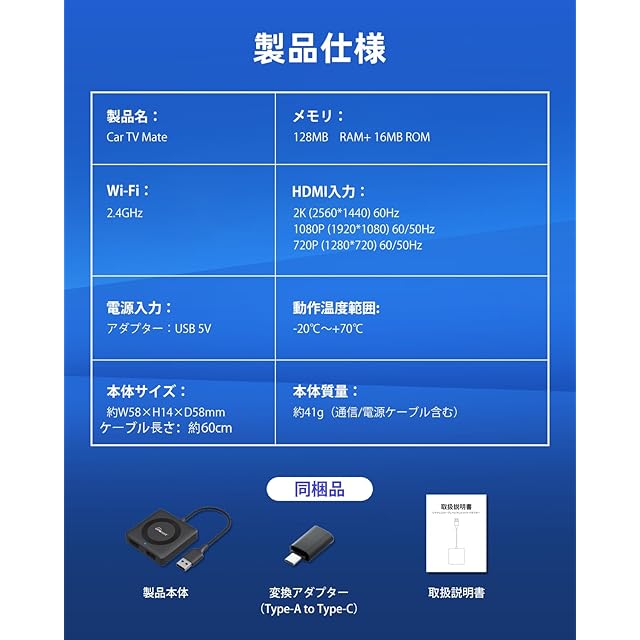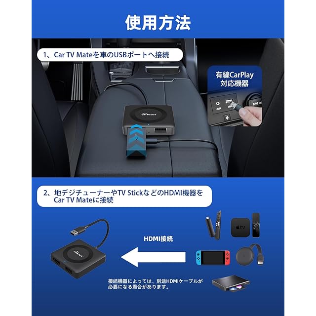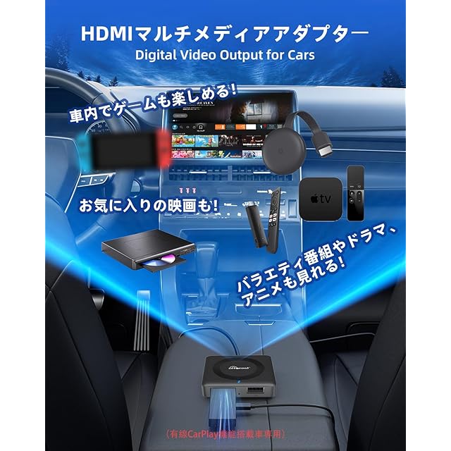 【注意事項】本製品単体で動画やテレビを見ることはできません。TV stickなどのストリーミングメディアプレーヤーもしくは地デジチューナーをご用意ください。また、本製品を使用する際には、外部のHDMIデバイスのリモコンまたは他の制御方法を使用する必要があります。また、製品本体のUSB-A端子が充電口ではなくて、ファームウェア更新用です。外部のHDMIデバイスに別途電力供給する必要がございます。本アダプターを使用する際には、CarPlay機能が使えません。
