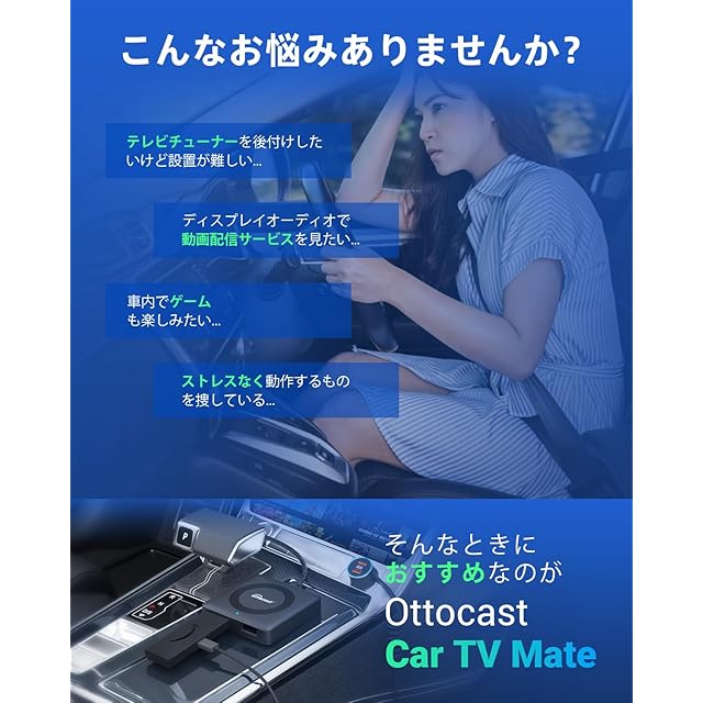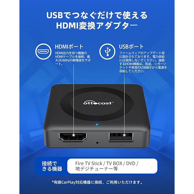 【Ottocast Car TV Mate】今回の新型carplay hdmiアダプターは有線のCarPlay搭載車専用のモノです。USBデータケーブルを使用して、お車のCarPlay対応USB口に挿して、有線CarPlayをHDMI高解像度入力に変換できます。Fire tv stickなどのストリーミングメディアプレイヤーやゲーム機等の外部HDMIデバイスを簡単に接続することができます。車カーナビでユーチューブやネットフリックスなどを観ることができます。