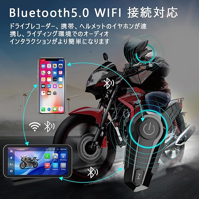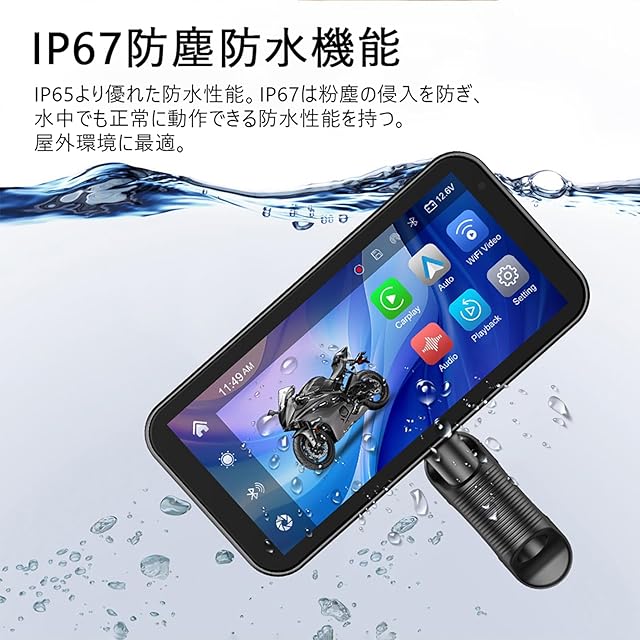 ★【製品概要】:6.25インチのバイク ドライブレコーダーは、前後のビデオ録画用に防水カメラを2台装備しています。CarPlayまたはAndroid Autoのワイヤレス接続を使用して、ライダーはGPSナビゲーション、音楽再生、BT通話、音声アシスタント、クリックコントロー 機能などのアプリサービスを利用できます。IP67防塵防水のケースは雨水の侵入を防ぎ、雨の日でも正常に使用できます