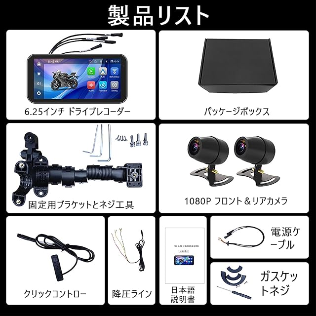 ★【製品リスト内容】:パッケージボックス*1、6.25インチ ドライブレコーダー本体*1、フロント&リアカメラ*1、クリックコントロー*1、降圧ライン*1、日本語説明書*1、電源ケーブル*1、ガスケットネジ*1、固定用ブラケットとネジ工具*1;ご注意、256GBのメモリカードは含まれていません。