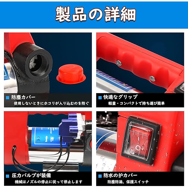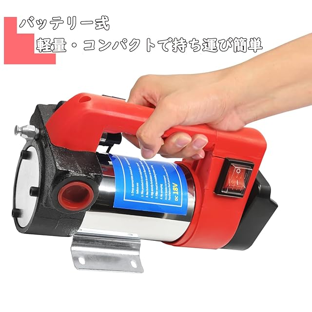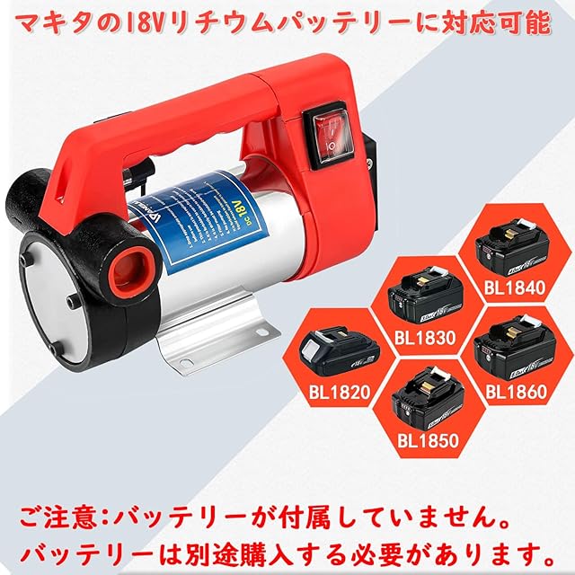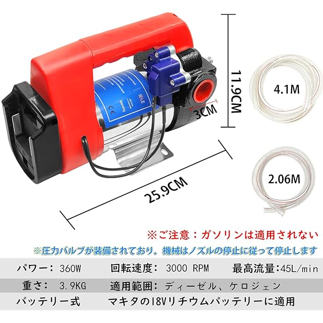 バッテリー式:マキタの18Vリチウムパッテリーに適用 (パッテリー別売、付属なし)最高流量:45L/min、吸引側ホース長さ約2m、吐出側ホース長さ約4m。燃料移送ポンプは、ディーゼル油、灯油の移送に最適です。