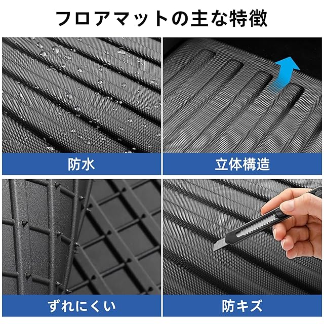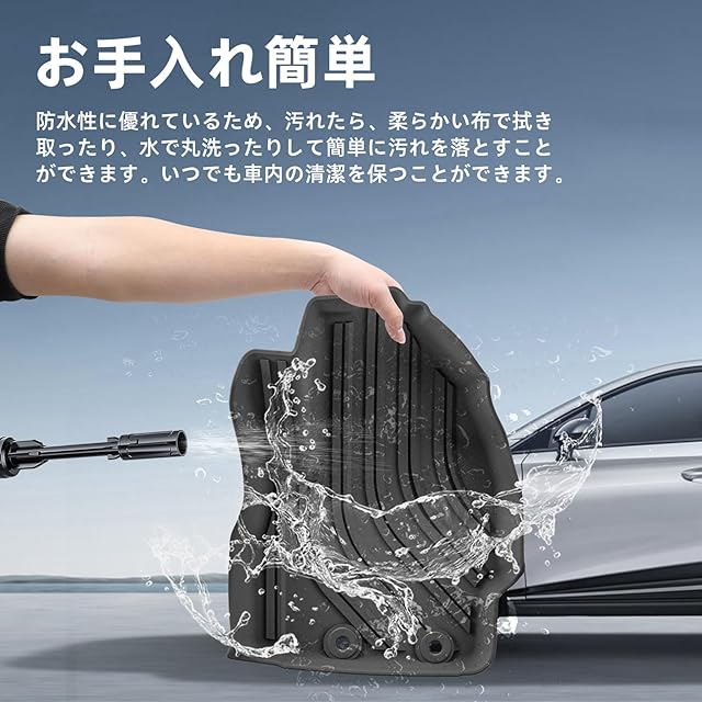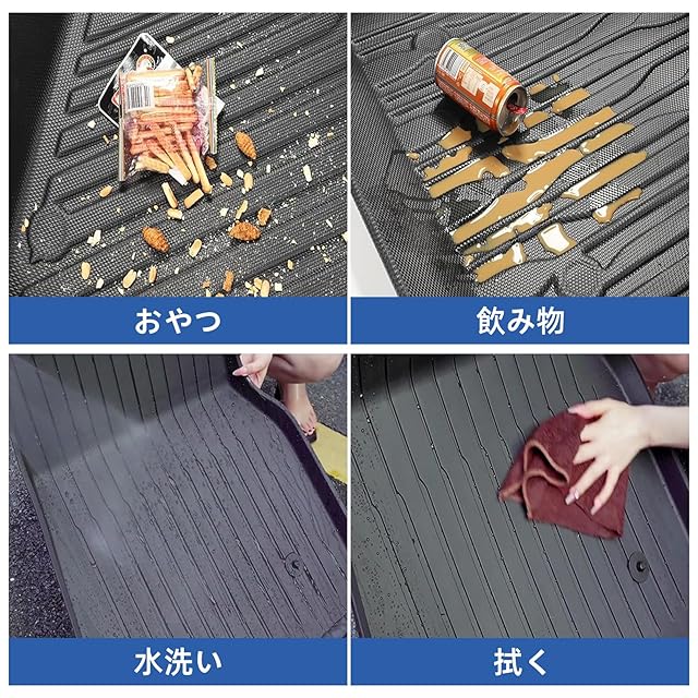 【3D立体構造・防水仕様】:マットは3D立体構造なので、縁部分が高めて作られ、水や汚れの侵入を防ぐことができ、耐汚れと防水性を実現しました。万が一水やジュースなどの飲み物がこぼれてもフロアマットの外への侵入を防止します。防水性に優れているため、汚れたら、柔らかい布で拭い取ったり、水で丸洗ったりして簡単に汚れを落とすことが出来まして抗菌効果も素晴らしいです。