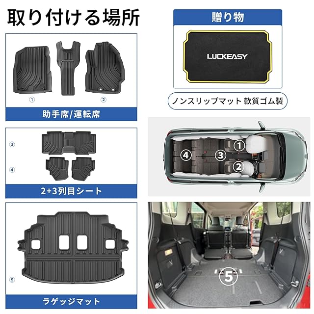 【適合車種】:トヨタ 新型 シエンタ MXP系 7人乗り。※5人乗りには不適合。型式:MXPC10G MXPL10G MXPL15G。※ガソリン車・ハイブリッド車に対応。年式:2022年8月~現行モデル(R4.8-現行)。【セット内容】:運転席用1P、センターパーツ1P、助手席用1P、二列目用1P、三列目用1P、トランクマット1P(合計:7Pセット)。※軟質ゴム製のノンスリップマットが含まれています。※年式・グレード・オプション等により適合しない場合が御座います。形状をご確認の上ご注文お願い致します。