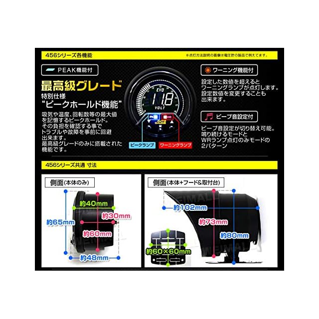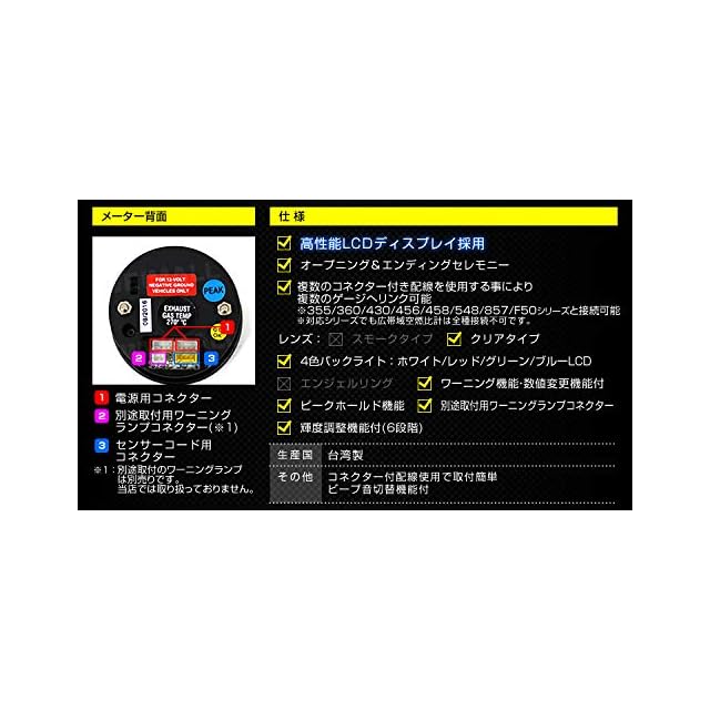 ●仕様 ・メーター径:60mm ・日本製ステッピングモーター ・4色バックライト(ホワイト/レッド/グリーン/ブルーLCD) ・コネクター付配線使用で取り付け簡単 ・複数ゲージへのリンク可能(360/430/456/458/548/857/F50シリーズと接続可能)