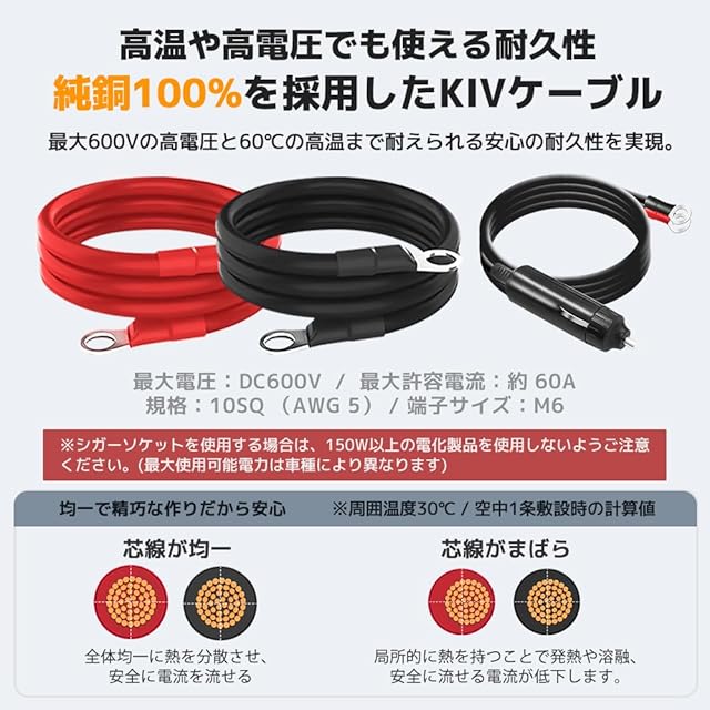 【付属品】10SQ 50CM電線*2、シガーソケットケーブル*1。