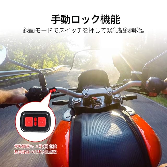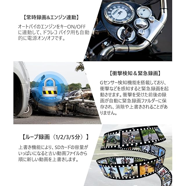 【安心録画機能・安全運転】 バイク ドライブレコーダーは、エンジン連動、ループ録画、衝撃録画、緊急録画、手動録画など多機能を備えています。「常時録画」オートバイのエンジンをキーON/OFFに連動して、本体が自動で録画を開始/終了です。「ループ録画」TFカード容量が不足になると自動に古いファイルから順に上書きします。「衝撃録画・Gセンサー」本体はGセンサーを内蔵されて、振動が感知されると、緊急録画を自動的に起動します。そのファイルが上書きされません。手動録画:何か面白いものを見たり、交通事故を目撃したりした場合は、現在の動画/画面を手動でロックして、緊急ファイルに保存できます。