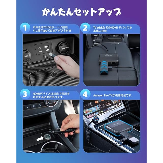 【かんたんセットアップ】①本体を車のUSBポートに接続②TV stickなどのHDMI デバイスを本体に接続 ③HDMIデバイスは別途で電源を供給する必要があります。④本製品を接続した後、ホーム画面で「HDMI」をタップし、HDMIデバイスを本製品のHDMIポートに接続してください。お使いのスマートフォンのホットスポット機能を利用して、Fire TV Stickにインターネット接続を共有することで、車内でHDMI入力映像を視聴できます。また、車載Wi-Fiを使用することも可能です。※本製品はスマートフォンのテザリング機能を直接使用することはできませんので、ご了承ください。