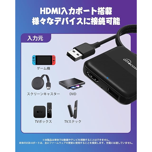 【幅広い対応機種】HDMI入力端子を備えており、TV stick/スクリーンキャスター/DVDやその他のデバイスを接続して利用することができます。※本製品は単体では動画やテレビを視聴することはできません。本体のUSB-Aポートは、主にファームウェアの更新に使用することを推奨します。充電には適していません。