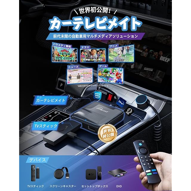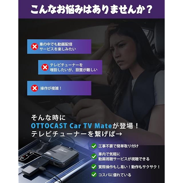 【公式】OTTOCAST オットキャスト 2024 新型 Car TV Mate カーテレビメイト HDMI出力のTV stick/スクリーンキャスター/DVDなど接続可能 USB Type-C交換アダプタ付き 有線CarPlay搭載車両専用 技適取得済み品