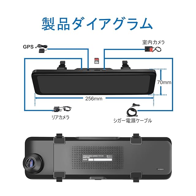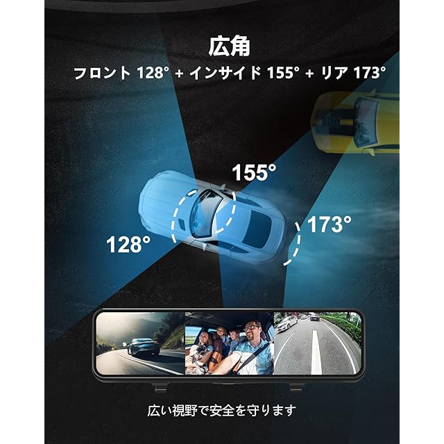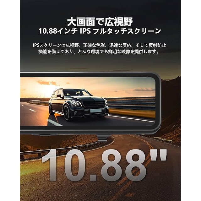 【10.88インチIPSフルタッチスクリーン&広角表示】このバックミラードライブレコーダーは、10.88インチのIPSスクリーンを採用し、鮮やかな色彩とシャープなディテールを映し出します。人間の目のカーブに合わせたデザインで、長時間の使用でも快適にご利用いただけます。広角表示により、前方・後方・車内カメラの映像を切り替えたり、同時に表示することが可能です。全方位カバーによって視覚の死角を減らし、運転中も一層の信頼感を提供します