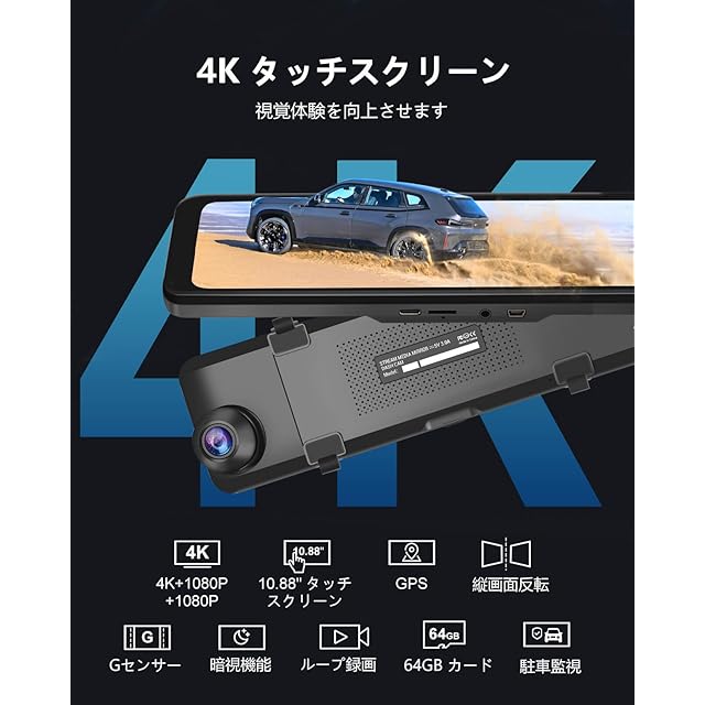 INSEETECH 4K 3カメラ ドライブレコーダーミラー型 前後&車内同時録画4K+1080P+1080P 10.88インチ IPSタッチパネル式 64GBカード付き WDR 超鮮明夜間暗視 GPS搭載 Gセンサー ループ衝撃録画 IP69Kリアカメラ 逆転アシスト 日本車対応 日本語説明書