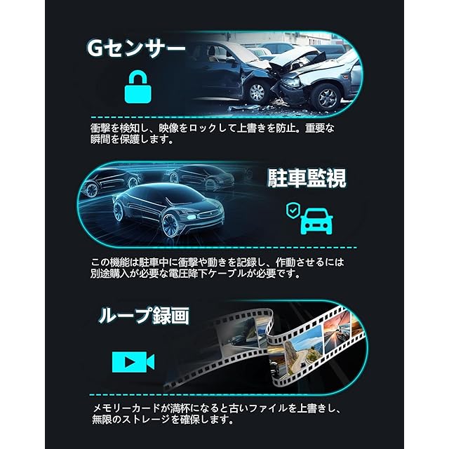 【ループ録画&敏感Gセンサー】INSEETECH 3カメラドライブレコーダーは、ループ録画機能でストレージが満杯になっても心配無用!古い映像が自動的に上書きされ、常に録画が続きます。さらに、敏感なGセンサーが急な衝撃を検出すると、瞬時に映像をロックし、上書きされないように守ります。大切な証拠を見逃すことなく、万が一の時にも安心して記録を保存でき、事故の瞬間をしっかりと記録します!また、INSEETECHの3カメラドライブレコーダーは、極端な温度変化にも対応できる設計で、高温・低温下でも安定した性能を発揮します