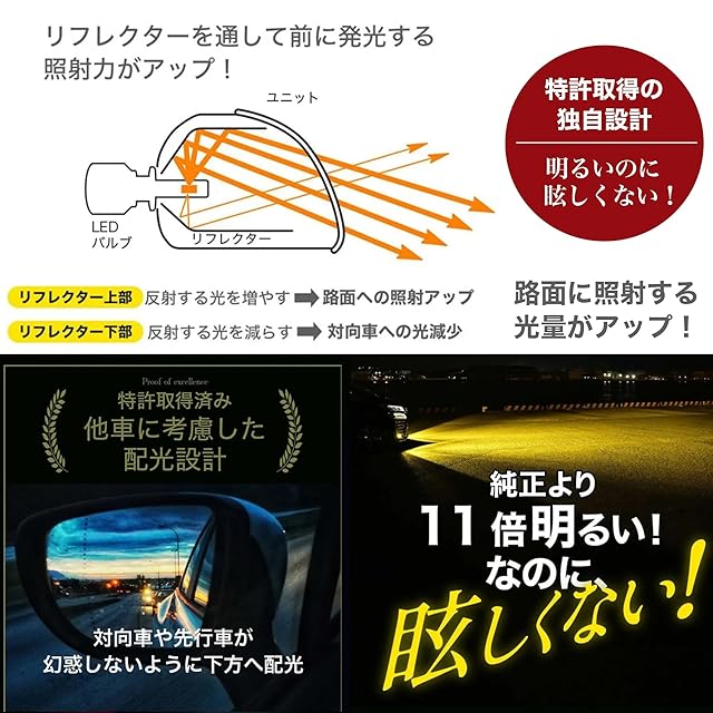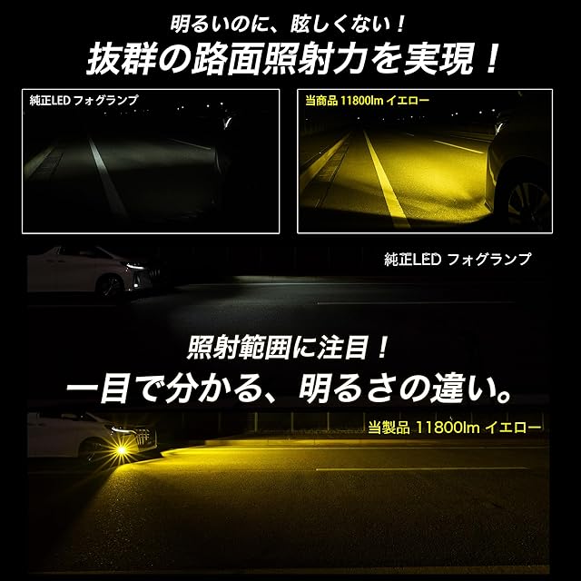 【純正比11倍/実測値11800lm】日本国内の第三者機関で正確に測定された実測値11800ルーメンを実現。H8,H11,H16形状に対応し、純正バルブの約11倍の圧倒的な光量で夜間のドライブの安全性を高めます。この爆圧光による路面への照射力の違いを体感してください。