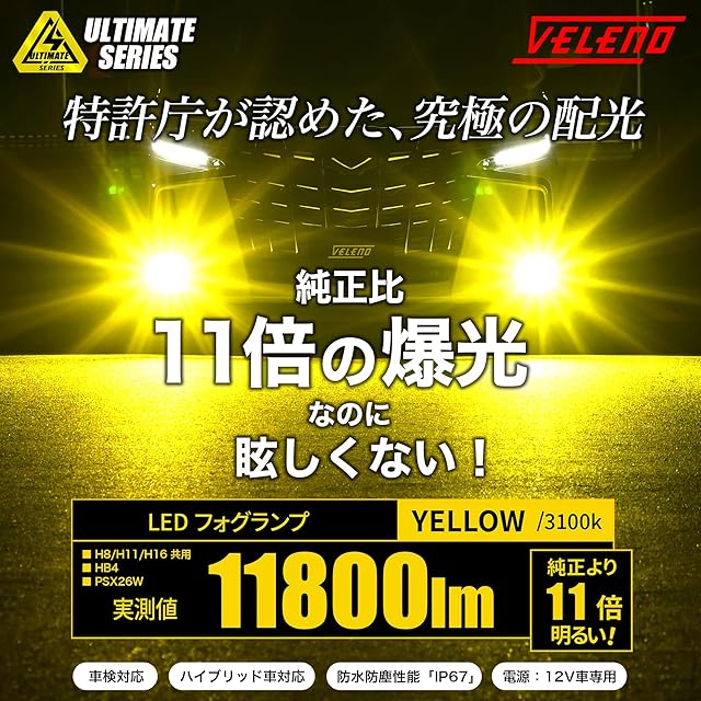 VELENO LEDフォグランプ H8 H11 H16 イエローフォグ 驚異の実測値 11800lm ULTIMATE 爆光 車検対応 黄色 3100k 12v 2球セット (H8/H11/H16 11800lm)