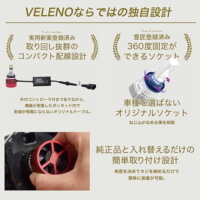 【簡単な取り付けと独自設計の技術の結晶】純正球を外して取り替えるだけの簡単交換。誰でも簡単に純正バルブと交換できます。実用新案登録済みのコンパクト配線設計や意匠登録済みの360度固定ができるソケットなどVELENO独自の技術が詰まった究極のLEDバルブです。ハイブリッド車対応の設計により、電圧変動の大きい車両でも安定した明るさを維持します。