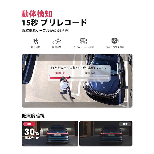 【24時間駐車監視 プリレコード 低照度暗視】動体検知、衝撃検知、タイムラプス録画とビットレート録画という4つの駐車モードを搭載しており、さまざまな駐車環境に対応できます!従来の動体検知機能では、動きを検出してから数秒後に録画が始まるため、決定的な瞬間が記録されないことがありました。本製品は15秒のプリレコーディング機能を備えており、動きを検知する15秒前の映像も保存されるため、万が一の際に証拠映像の完全性を確保できます。また、地下駐車場など、光が少ない低照度の環境では、低照度暗視機能により映像の視認性が30%に向上します。※ご注意:駐車監視機能をご利用するには、別売の直結電源ケーブルが必要します。(ASIN: B0C2PTBNHH)