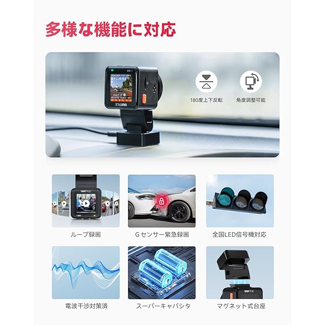 【映像の確認のしやすさ APP制御 音声コマンド GPS機能】5.8GHz WiFi機能が搭載されており、スマートフォンから専用アプリ「Vantrue」を使用してリアルタイムの映像を見ることができます。また、スマホを使ってドライブレコーダー本体のさまざまな機能設定を調整し、簡単に動画をダウンロード、編集、共有することも可能です。OTAアップデート機能も備えているため、パソコンがなくてもスマートフォンから簡単にドラレコ本体のソフトウェアをアップデートできます。さらに、音声コントロール機能が搭載されており、簡単な言葉でドライブレコーダーのスクリーンのオン/オフ、静止画撮影、緊急録画などを操作できます。ハンズフリー操作により、運転に集中でき、安全で快適なドライブを楽しめます。内蔵GPSにより、走行ルートや速度、位置情報も記録され、万が一の際には有力な証拠として役立ちます。さらに、GPS信号に繋がると日付/時刻は自動で訂正されます。