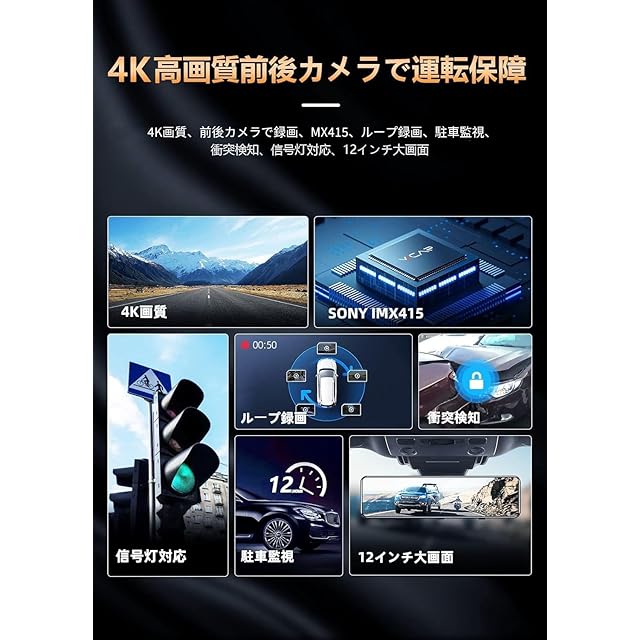 JADOドライブレコーダー ミラー型 4K録画 ドラレコ 後カメラズーム機能 2160P 12インチ 前後カメラ デジタルインナーミラーIMX415センサー Type-C電源ポート 夜間撮影 HDR/WDR搭載 駐車監視タイムラプス 170° 超広角 上下画像+左右画像逆転可能 デフォルトの表示モード設定可能 64G メモリーカード付き 地デジTVノイズ対策済 LED信号機対応 G850+