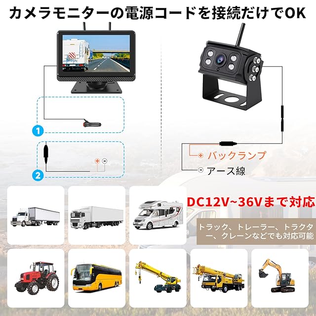 【安定性の高いタイプ】映像信号がモニターまで飛ばすたいぷですので、大変なケーブルの引き回しは要らず、配線はそれぞれの電源ケーブルを繋げるだけで完了です!また安定性が高くて、効率もより抜群なデジタル映像信号で、遅延の感じない程度のバックカメラ映像をモニター画面に映し出せます。