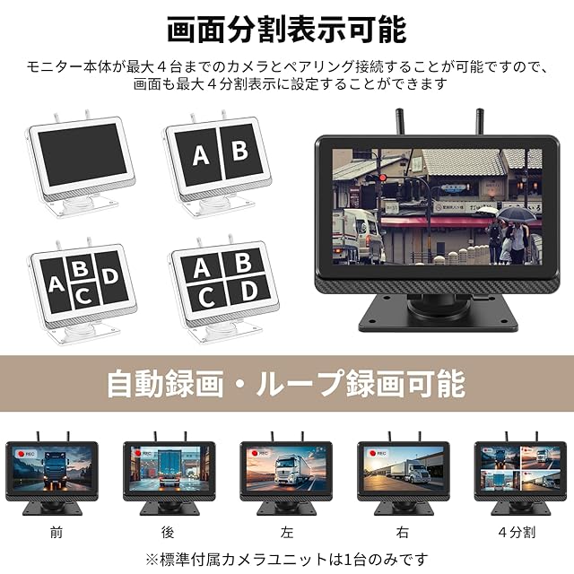 【最大4分割表示可能】最大4台までのカメラとペアリング接続することが可能で、お必要に応じて、増設カメラをモニターとペアリング接続することで、2分割、4分割に設定すると、同時にカメラ2台、4台の映像を確認することができます。ご注意:標準付属カメラユニットは1台カメラのみです。
