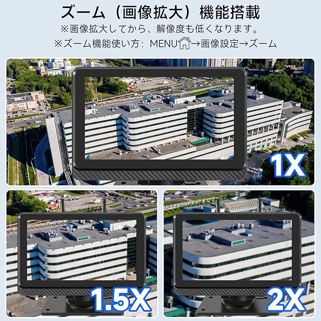 【画面拡大機能搭載】皆様のご意見をご参考し、1x、1.5x、2xのズーム機能(画像拡大)もカメラに搭載いたしました。特に特定な場所(クレーンなどの場合)での作業効率も大幅に向上させることができます。ズーム機能はモニターのメニューリストにある「画像設定」から手軽に調整することができます。ご注意:画面拡大すると、映像解像度も低くなります。
