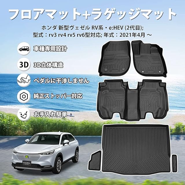 【適合車種】ホンダ 新型ヴェゼル RV系・e:HEV(2代目);型式:rv3 rv4 rv5 rv6型対応;年式:2021年4月 〜。【セット内容】1列目フロアマット×2点&2列目フロアマット×1点&ラゲッジマット×3点(合計6点セット)※形状、年式とモデルをご確認頂いた上、お買い求めください。