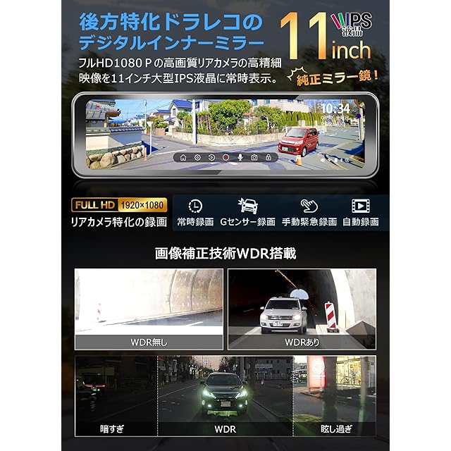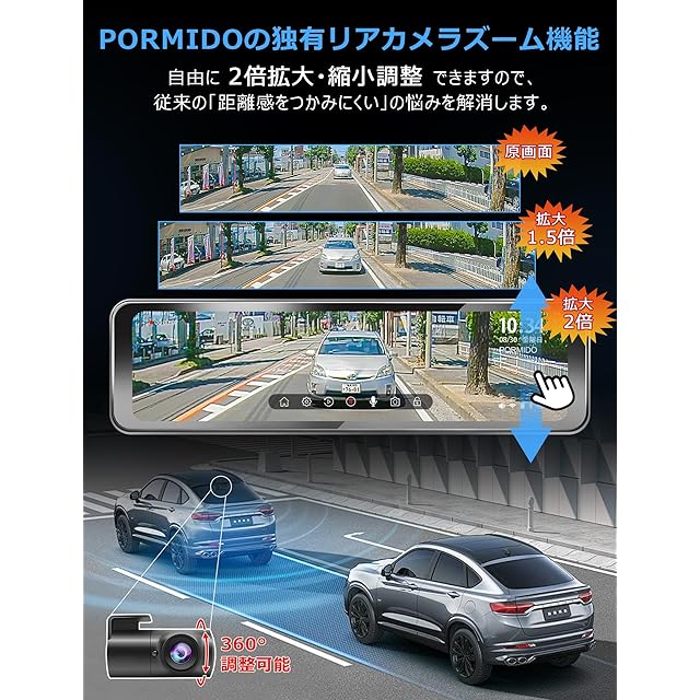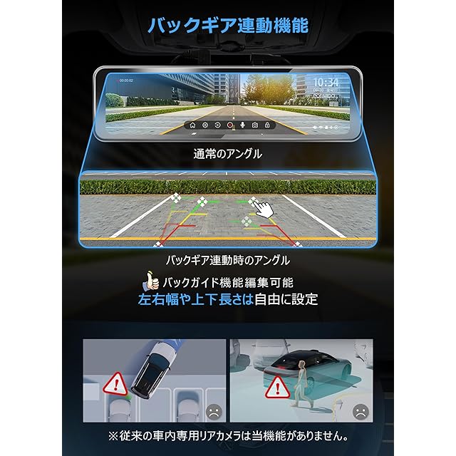 ✨【後方特化1080P録画・ズーム機能付きリアカメラ】リアカメラは1080Pの高画質で後方をクリアに録画できます。従来のデジタルインナーミラーはお客様から「距離感をつかむのが難しい」「リアカメラの映像を自由に拡大できる機能が欲しい」との声をいただきました。本製品は新たにリアズーム(拡大)機能を搭載し、リアカメラ映像のサイズを純正ミラーの映像と同じに設定することで、より自然な距離感を得られるよう改良されています。このような機能進化により、運転中の安全性と快適性が大幅に向上します。